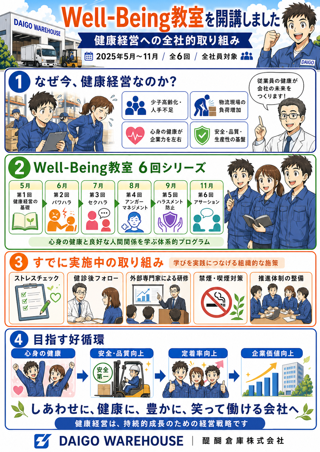 健康経営の実現に向け、醍醐倉庫は2025年5月より、及川健康管理士事務所の及川寿彦氏と産業医・医師である佐野正行氏を講師に迎え、全6回のWell-Being教室を開講いたしました。このプログラムは、従業員の心身の健康と良好な人間関係構築に関する体系的な学習を提供するものです。