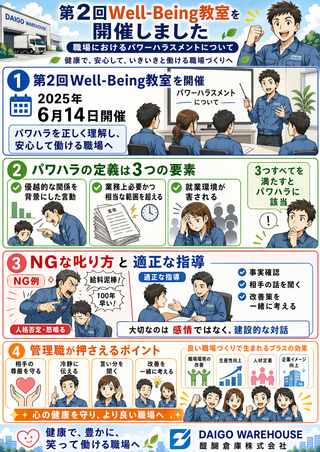 第2回のパワーハラスメント研修は、全10回のWell-Being教室カリキュラムの一環として、「心の健康」の深化と「職場環境の改善」を目指しています。