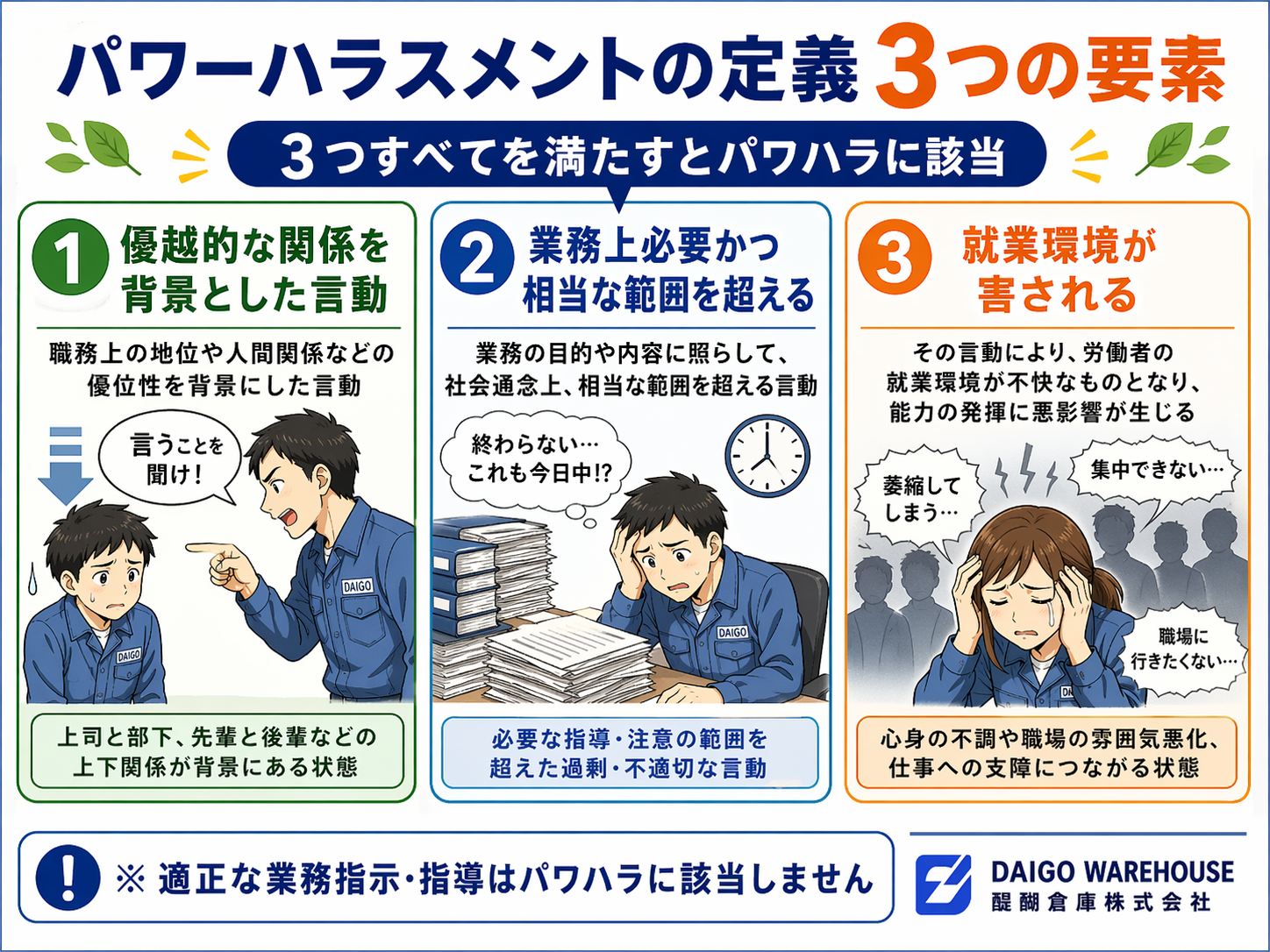 ※重要:客観的にみて、業務上必要かつ相当な範囲で行われる適正な業務指示や指導は該当しません。