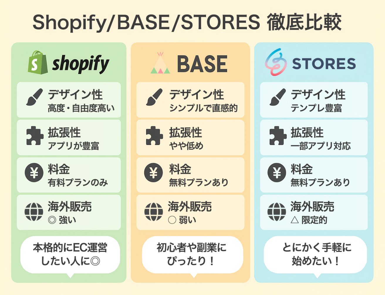 | Shopify | ・デザインの自由度と拡張性が非常に高い ・海外販売に強い(多言語・多通貨対応) ・アプリが豊富で機能追加が容易 | ・本格的にブランドを育てたい ・将来的に海外展開を考えている ・独自の機能を実装したい | ベーシック: $33 USD〜 +決済手数料 |