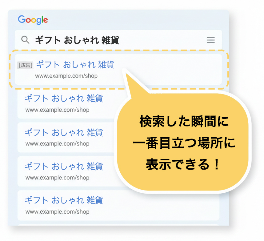 リスティング広告(検索連動型広告)は、Googleなどでユーザーが検索したキーワードに連動して表示される広告です。ニーズが明確なユーザーに直接アプローチできるため、費用対効果が高いのが特徴です。